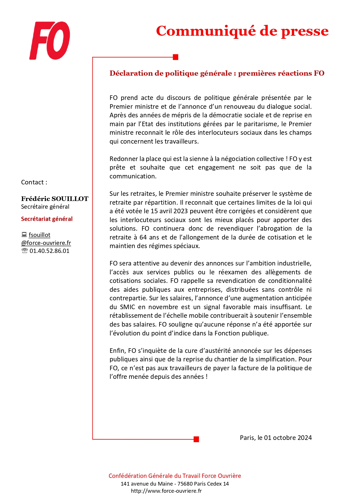 Discours de politique générale du Premier ministre Michel Barnier : nous l’attendions sans trop y croire et nous n’avons pas été déçus. Hier, le nouveau Premier ministre, Michel Barnier, a fait son discours de politique générale devant l’Assemblée nationale. Sans grande illusion, la Fédération FO des personnels des Services Publics et des Services de Santé (FO-SPSS) attendait de connaître les choix politiques et les grandes orientations du nouveau gouvernement après de longs mois d’attente.